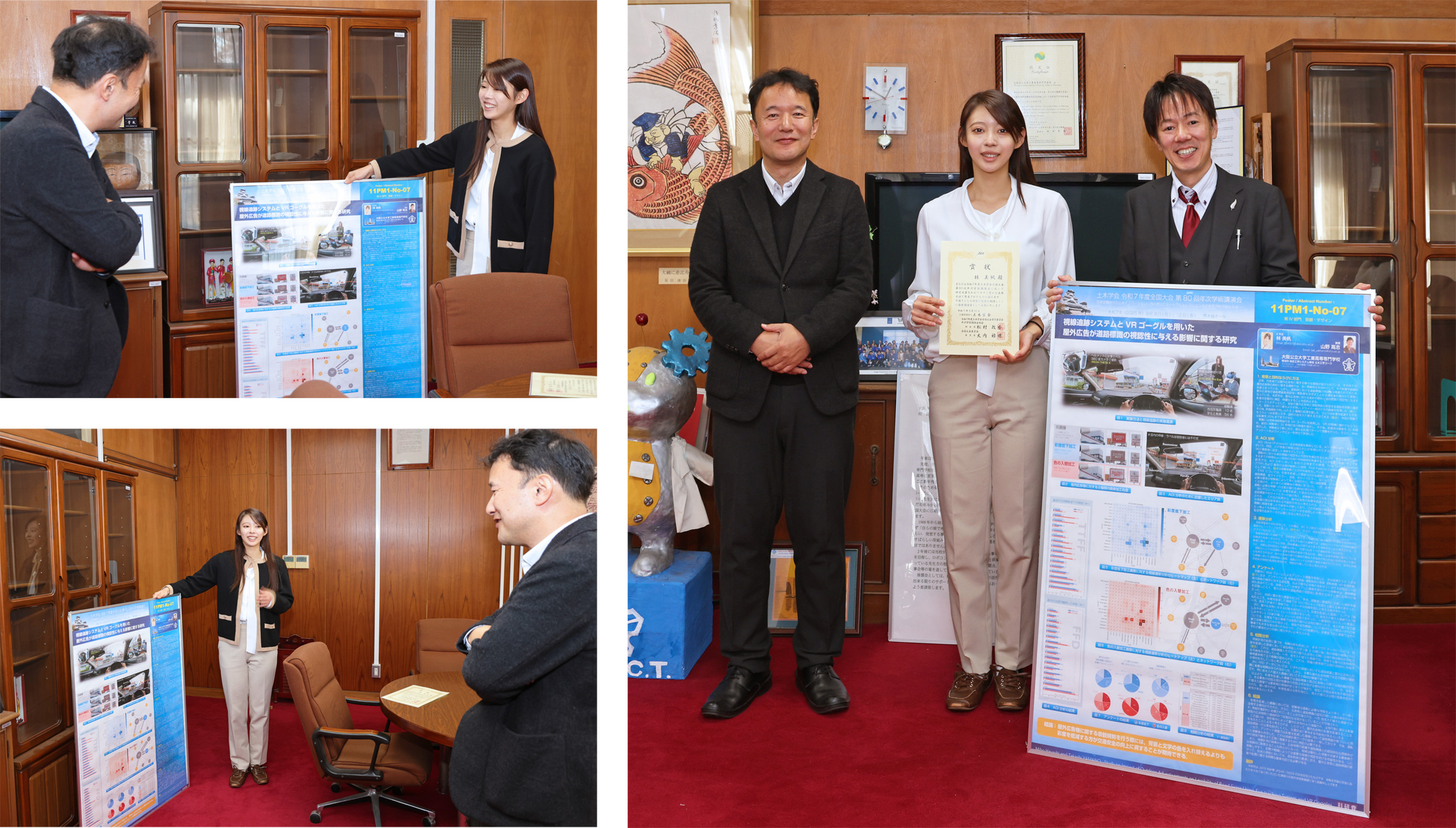 発表題目はJSPS科研費JP24K15629の助成を受けた研究に関する「視線追跡システムとVRゴーグルを用いた屋外広告が道路標識の視認性に与える影響に関する研究」です。林さんは別の学会発表においても優秀研究発表賞を受賞しており、結果としてパワーポイントによる口頭発表と、ポスター発表の両形式で受賞するという快挙を達成いたしました。今後のさらなる活躍にご期待ください。